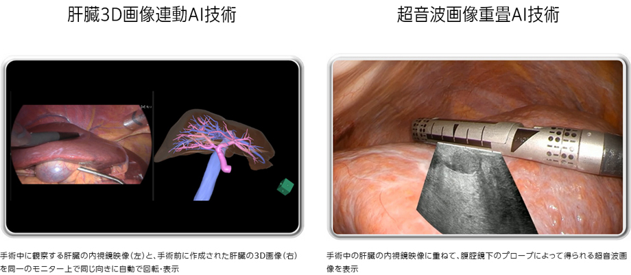 「肝臓3D画像連動AI技術」は、内視鏡映像内の肝臓に合わせて、手術前に作成した肝臓の3D画像を同じ向きに自動で回転させ、同一モニター上で参照できるようにすることで、肝臓の表面からは観察することが難しい肝臓内部の血管構造や腫瘍の位置などの把握をサポートする技術である。「超音波画像重畳AI技術」は、「腹腔鏡下手術」や「ロボット支援下手術」の際に行われる術中超音波検査において、腹腔鏡やロボットの内視鏡映像内の超音波プローブの位置や方向を解析し、超音波画像を内視鏡映像上に重畳表示することで、直感的な超音波画像の理解をサポートする技術である。同社が開発したARマーカー(Augmented Reality Marker:拡張現実技術を活用するための目印)付き超音波プローブと組み合わせて使うことで、術中超音波検査の手技を支援する。今後、富士フイルムは、これらの技術を搭載したソフトウェア製品を早期に発売することで、肝臓領域における外科支援市場に新たな価値を提供する。