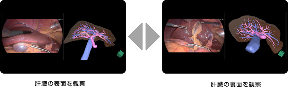 手術中に観察する内視鏡映像から肝臓の向きを解析し、事前に作成した肝臓の3D画像を内視鏡映像と同じ向きに自動で回転・表示する。肝臓の表面からは観察することが難しい肝臓内部の血管構造や腫瘍の位置などの把握をサポートする。