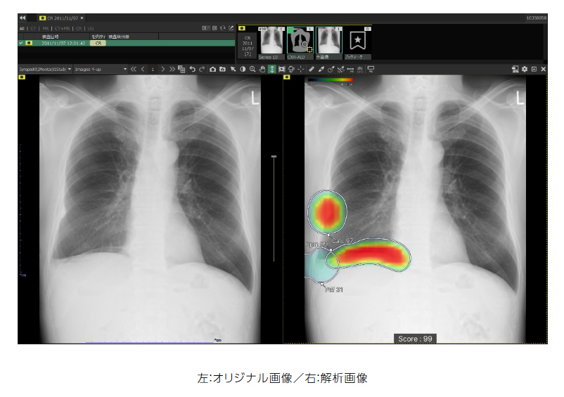 肺がんや肺炎、気胸は早期発見・早期治療が行われないと重篤化する恐れがあるため、速やかに診断し適切な治療を行うことが重要である。しかし、胸部単純X線画像では骨や血管、臓器が重なって写るため、病変の発見が困難な場合がある。特に健康診断など膨大な数の画像を短時間で読影する現場では、医師に高い集中力と細心の注意が求められる。