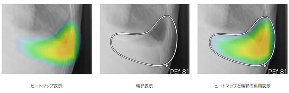 異常所見の存在可能性(確信度)を、青から赤へのグラデーションで示すヒートマップ表示について、多くの利用者からご好評いただいている。一方、モノクロモニタを利用する一部の読影環境では、淡いヒートマップが確認しにくいという課題があった。新バージョンでは、異常所見の疑われる領域の表示方法として、「ヒートマップ表示」「輪郭表示」「ヒートマップと輪郭の併用表示」の3つの表示パターンが選択可能になった。これにより、各施設の運用環境に応じた最適な表示方法を利用できる。