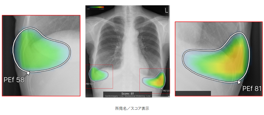 従来のバージョンでは、複数の異常所見を検出した場合、検出された異常所見のうち最も確信度が高い所見のスコアのみを表示しており、各所見のスコアを確認したいという要望があった。新バージョンでは、各検出領域に対応する所見名と確信度を示すスコアを個別に表示できるようになった。これにより、医師は複数の異常所見について詳しい情報をひと目で把握でき、正確な診断を行うことが期待できる。