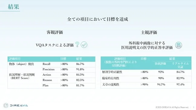Direava(ディリーバ)はNEDOと経済産業省が実施する「GENIAC」の一環として、手術状況をリアルタイムに理解し、対話する国内初の外科特化型生成AI(Surgical VLM)を開発した。