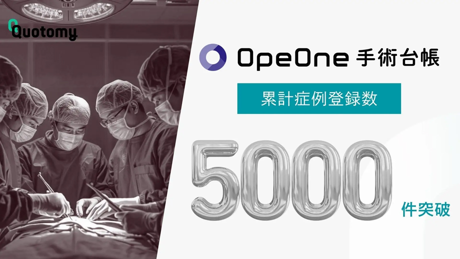 株式会社クオトミー(本社:東京都千代田区、代表取締役CEO・医師:大谷隼一)が提供する外科系チーム医療DXサービス「OpeOne(オペワン)手術台帳」は、累計症例登録数が5,000件を突破した。大学病院5施設を含む複数の地域中核病院・有床診療所での本格導入が進んでおり、外科系医療現場における業務効率化の需要が高まっている。