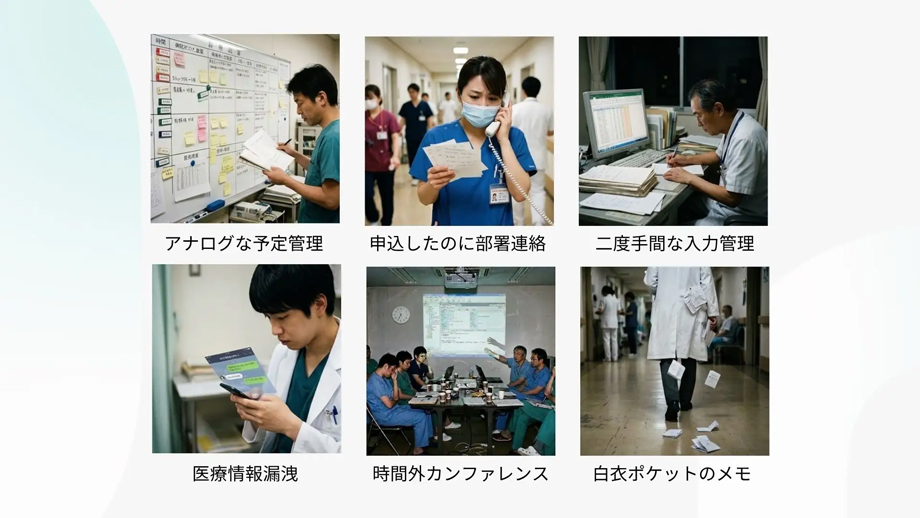 整形外科医として15年にわたる病院勤務の経験から、手術診療に伴うアナログ業務の実態を身をもって知っています。外科系医療者は、本来の専門性とは切り離された「ノンコア業務」に多大な時間を費やしており、手術診療がチーム医療である以上、その負担は多職種にわたります。これは地域中核病院にとって切実な経営課題でもあります。