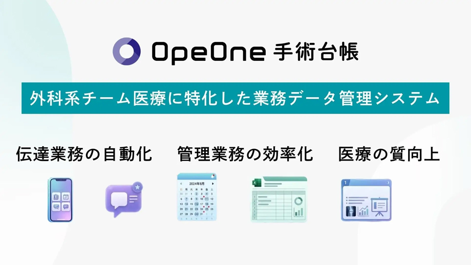 OpeOne手術台帳は、病院で日常的に行われる手術症例に関わる医療者間のチーム医療業務を、モバイル化・自動化・効率化するサービスである。伝達業務・管理業務・医療の質向上に資する事務作業を体系的にデジタル化し、外科系医療者の業務負担を大幅に軽減する。