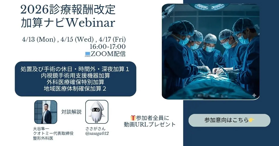 また、2026年4月中旬に手術や外科系医療に関する加算についての病院関係者向けウェビナーも企画している。ご関心のある病院関係者の方は参加意向フォームのご確認をお願いする。
