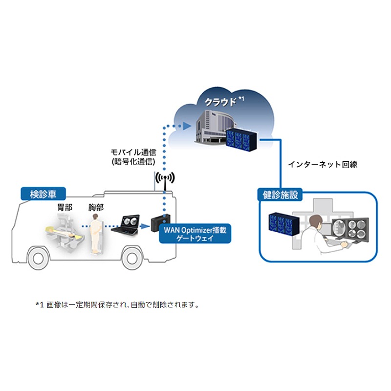 独自の高速ファイル転送技術で撮影した医用画像を検診車からクラウドへ自動で高速転送し、健診施設で即座に利用可能なサービスを提供します。