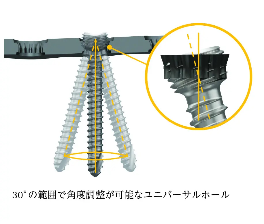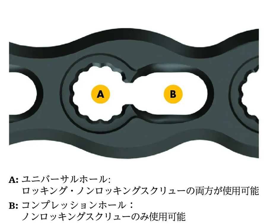 「Pangea」シリーズ(以下、本製品)は、各国の整形外科医による豊富な臨床経験と日本人を含む35,000件以上に及ぶストライカー独自の3D骨データベース「SOMA(Stryker Orthopaedics Modeling and Analytics)」をもとに開発し、プレートが解剖的な骨形状に沿うように設計した。本製品は、チタン合金製のプレートとコバルトクロム合金製のロッキングスクリューの硬度差を利用して骨折部位を固定する。(参考画像1)また、スクリューの挿入角度を最大30度まで調整できる「バリアブルアングル(可変角度)ロッキングテクノロジー」により、骨折固定の際、至適位置にスクリューを挿入できる。(参考画像2)さらに、「ハイブリッドロッキング・コンプレッションホール(ハイブリッドLCホール)を採用することで、骨折形態に応じて、ロッキングスクリューを挿入するか、コンプレッションテクニックを採用するかを術中に選択することが可能である。(参考画像3)骨折部位ごとに異なる形状を持つ20種類のアナトミカルプレートに対し、スクリューや手術用器械は共通のプラットフォームを採用し、術者の操作性向上や手術室の効率的な運用にも寄与する。