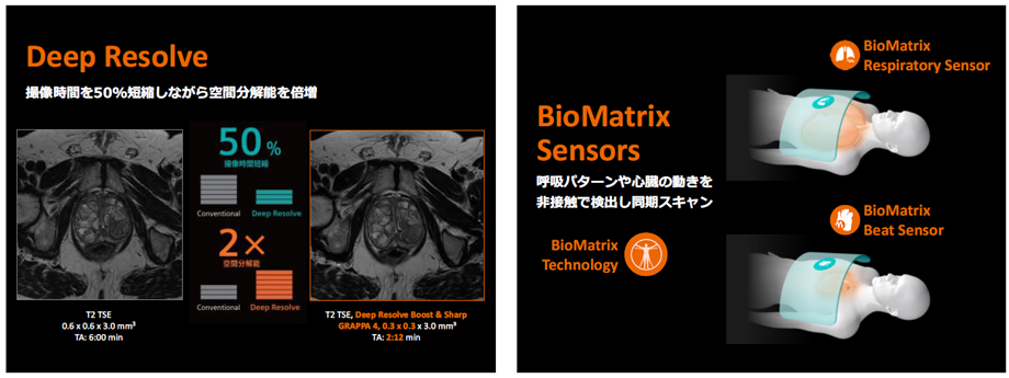 ●AIを用いた 画像再構成技術Deep Resolve を搭載し、撮像時間を50% 短縮※2しながら、空間分解能を倍増させた高精細な画像を提供する。Deep Resolve は2D 撮像に加え3D撮像にも対応し、臨床検査における画質とスループットを飛躍的に向上させる。