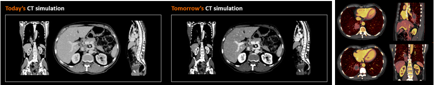 1. 呼吸同期撮影機能:スペクトラルイメージング画像を活用した4D撮影により、呼吸による標的臓器の動きを高精度に把握する。腫瘍や臓器の移動を考慮した治療計画の作成を支援する。