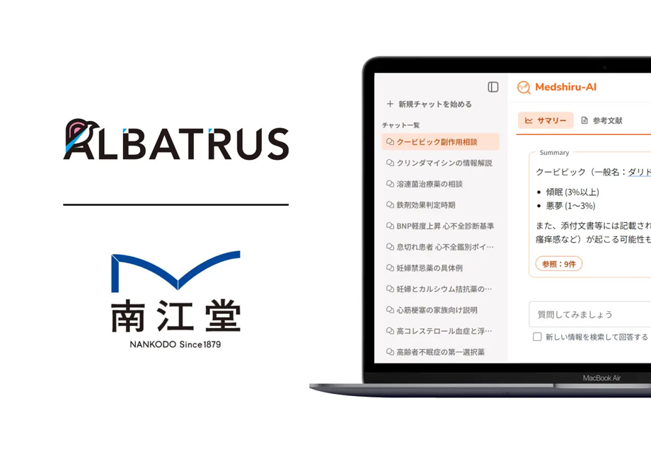 株式会社Albatrus(本社:三重県津市、代表取締役CEO:星野 仙太、以下 Albatrus)は、株式会社南江堂(本社:東京都文京区、代表取締役社長:小立健太、以下 南江堂)の信頼性の高い医療書籍を参照データとして活用した、医療現場専用ナレッジAI「メドシルAI」を開発し、法人および個人向けに提供を開始する。