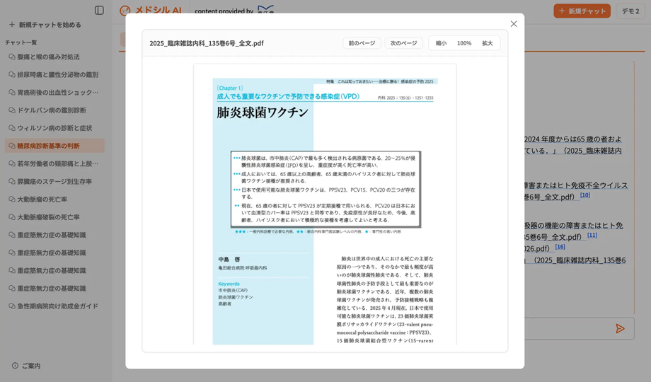 1. 信頼できる「南江堂」の医学書データに基づく回答生成:汎用AIとは異なり、参照元を南江堂の医学書に限定しています。回答には必ず「根拠」が紐付いており、インターネット上の不確かな情報が混入することはありません。