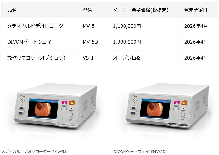 TEAC(ティアック)は、2019年より販売してきたMV-1の後継機種として、セキュリティ機能を強化した新たなメディカルビデオレコーダー『MV-5』を、国内市場向けに2026年4月より販売する。