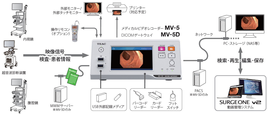 また、内視鏡が映し出す映像を DICOM フォーマットとして記録する DICOM ゲートウェイ 『MV-5D』もラインナップする。『MV-5D』は DICOM 規格に対応していない内視鏡からの映像を DICOM フォーマットとしてサーバーへ転送を可能にする機能を持ち合わせた DICOM ゲートウェイである。