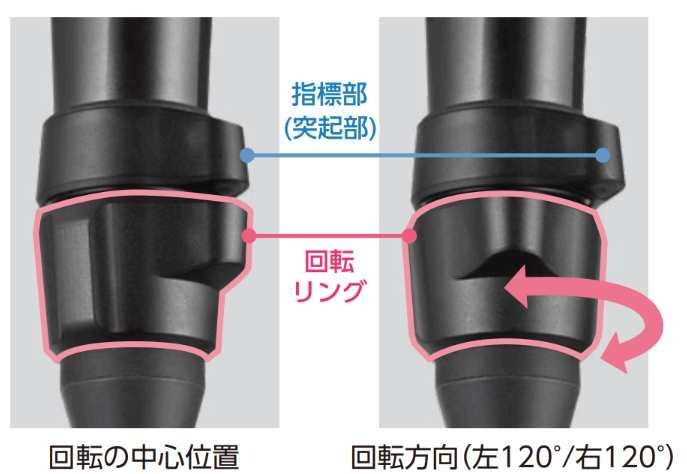 指標部と回転リングの突起部を同一形状とすることで、回転中心位置の把握をサポートする。