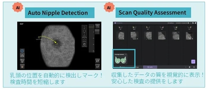 AI技術を取り入れた新しい機能*は、検査時に乳頭の位置を自動的に検出し、取得したボリュームデータの撮影範囲やスキャンの品質などを視覚的に表示する**。また、撮り忘れ防止のサポートや自動化による医療従事者への作業負担の軽減でスムーズな検査環境に寄与する。その他、ハードウエアの刷新でスキャン速度が従来より約40%***短縮し、検査時間の削減にも貢献する。