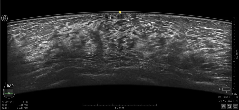 乳房にあてるプローブは、よりフィットするように設計され、周波数帯域も広がったことで空間分解能とコントラスト分解能が向上している。全ピクセルにフォーカスがあたる信号処理、乳頭直下が見えやすくなる画像処理は刷新され、より均一性の高い画像を提供する。