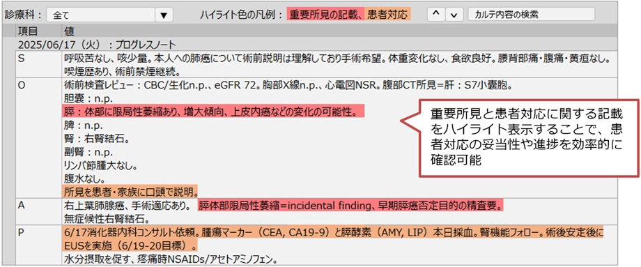 今回提供を開始する「患者対応監査支援AI」は、患者対応が適切に行われているかの確認を支援する機能である。同社の統合診療支援プラットフォーム「CITA Clinical Finder」のオプションとして、提供する。本機能は、AI技術を活用し、全患者のCT検査レポートの一覧から所見の悪性度や偶発性を踏まえて、重要所見が含まれる可能性の高いレポートを自動的に抽出するとともに、患者説明や追加検査のオーダーなどの患者対応が適切に行われているかを判定。医療監査部門向けに対象レポートと患者対応状況をリストアップ表示(下記図1)する。さらに、患者ごとの画面では、患者対応が適切に行われているかを判定する根拠とした診療録の内容をハイライトして表示する(下記図2)。多くの診療録の中から、対応の妥当性の検証や進捗確認などに必要な情報を選別し、自動表示することで、監査業務の効率化を支援する。