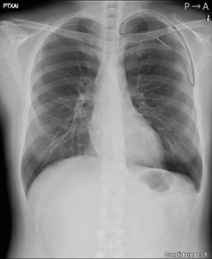 気胸とは、何らかの原因で肺に穴が開き、肺がしぼんでしまう状態を指す。胸の痛み、咳、息切れや呼吸困難などの症状を伴うことがあり、緊張性気胸に進展した場合には生命に危険が及ぶ可能性がある。そのため、早期発見・診断が重要であるが、胸部単純X線画像撮影の主目的が気胸の確認ではない場合は見落とされるリスクが高い所見でもある。