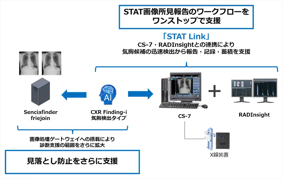 「STAT Link」は、気胸検出機能、所見報告・記録機能、「RADInsight(ラドインサイト)」との連携機能により、STAT画像所見報告のワークフローを包括的に支援する。
