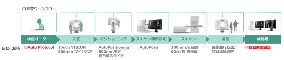 今回、①検査オーダー、②検査後の後処理においてもAI技術を活用して開発した機能を加えることで、CT 検査全体のワークフロー効率を向上させた。