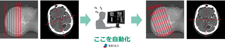 従来、傾いた体位で撮影された場合には、手動でMPRの角度や範囲を設定する必要があった。そこで、AI技術を活用して開発した画像認識技術により、正常な体位と同様の断面となるよう撮影後に角度調整して、頭部の回転とOMラインの作成範囲を自動設定できるようにした。