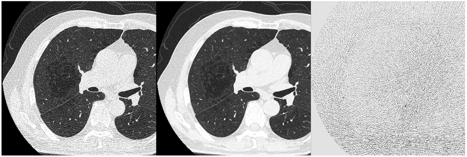 従来の逐次近似処理では、処理後の画像ボケやコントラスト低下などを理由に、撮影線量を十分に下げられないなどの課題があった。そこで、さらなる低被ばく化をめざして、Deep Learningを設計段階で用いて画像再構成技術DLR Focusを開発した。DLR Focusは、低線量撮影したノイズの多い画像に対して、構造を維持したままノイズを低減する*8。