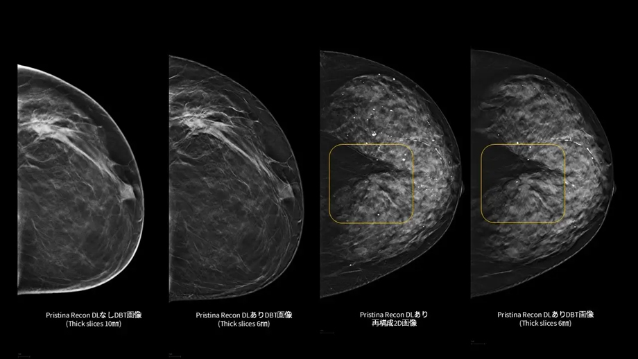 さらに、ディープラーニングを用いた高度な画像再構成技術により、アーチファクト(虚像)や視覚的ノイズを低減し、微細構造の視認性を向上させる。これにより、DBT/3Dマンモグラフィおよび再構成2D画像の双方において、読影に必要な情報をより明確に可視化し、診断を支援する読影環境の向上に貢献する。