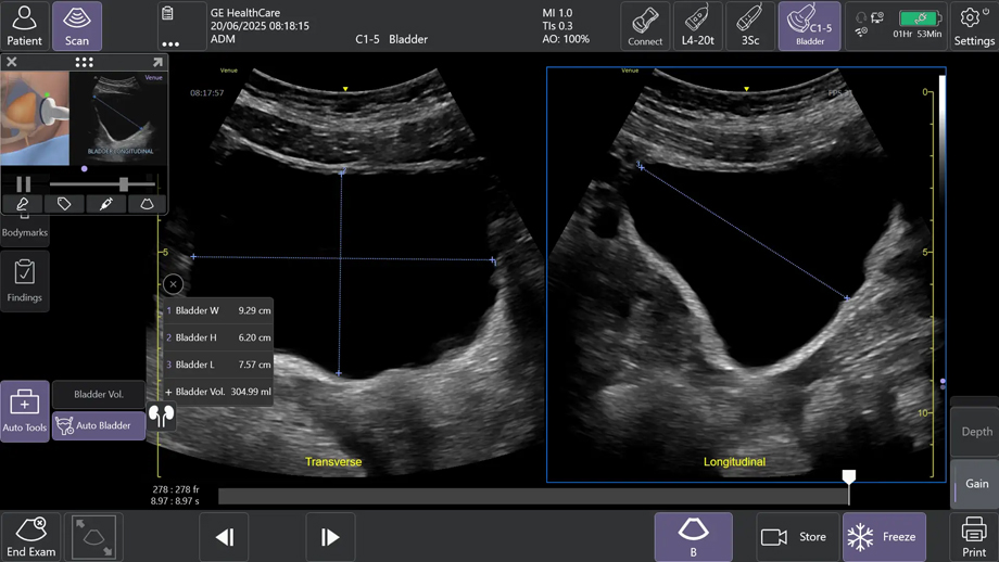 AIを用いて開発されたAuto Bladder Volumeは、膀胱の容積を半自動で計測するツールである。横断像および縦断像の2方向の画像から、AIが自動的に膀胱形状を認識し容積を算出するため、再現性の高い評価が可能になる。